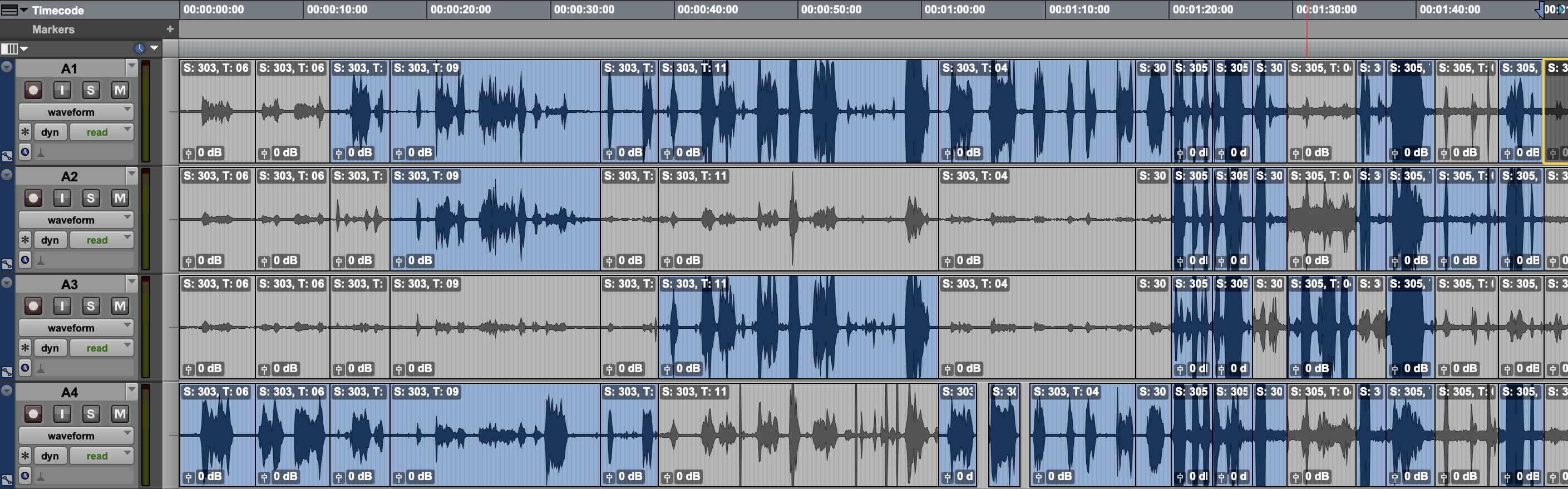 The program analyzes the material that remains in the “vertical” domain — meaning the actual dialogue on the primary microphone, as well as the bleed on the other tracks — and selects the best available option.